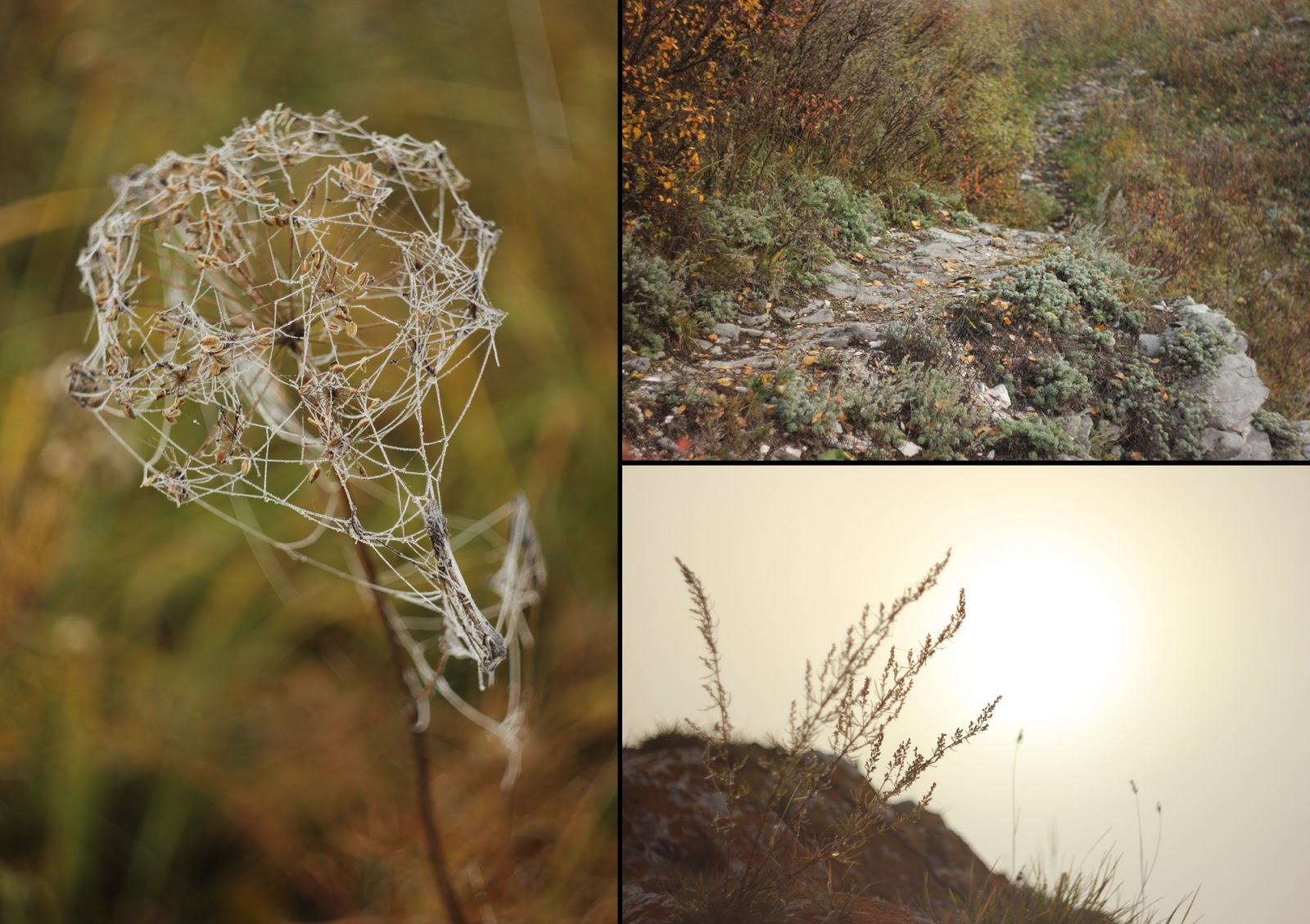 | Теплый целый спальник отдал жене. Мой же не застегивается и холодный. Поэтому встал рано, задубел. В 6 утра обнаружил дикий туман и лед на палатке и паутине в траве |